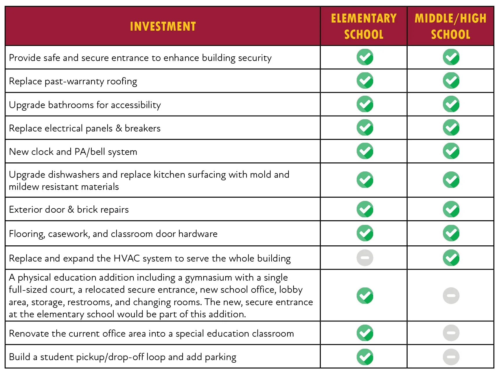 On Tuesday, June 10, the district will ask voters to consider a single ballot question seeking a $19.9 million investment to address both school buildings' most urgent maintenance, security, and learning space needs. The investment plan has four primary goals: